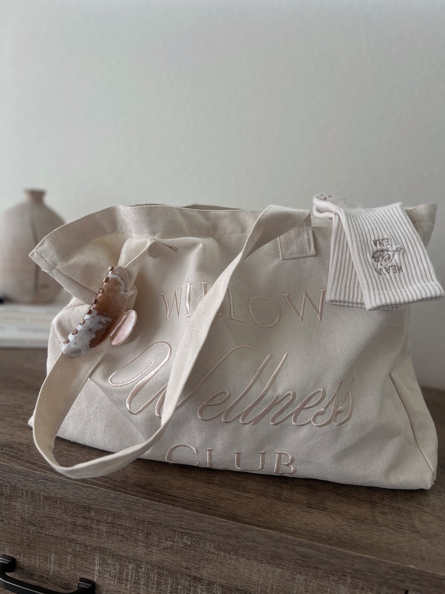 Welcome to the Willow Wellness Club. Thoughtfully made in natural canvas with tonal embroidery, perfect for your grip socks, water bottle, and post-class layers.